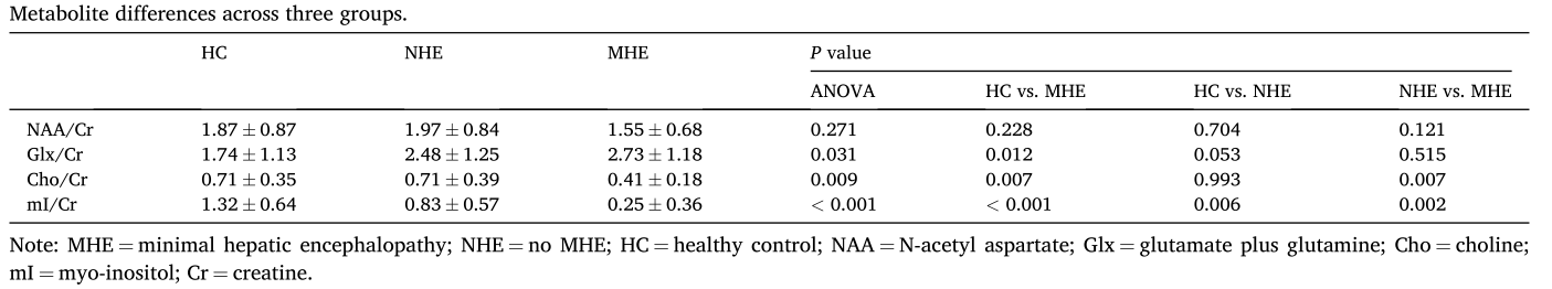 2. 轻微型肝性脑病丘脑代谢紊乱及其与局部神经功能障碍和认知损伤的关系