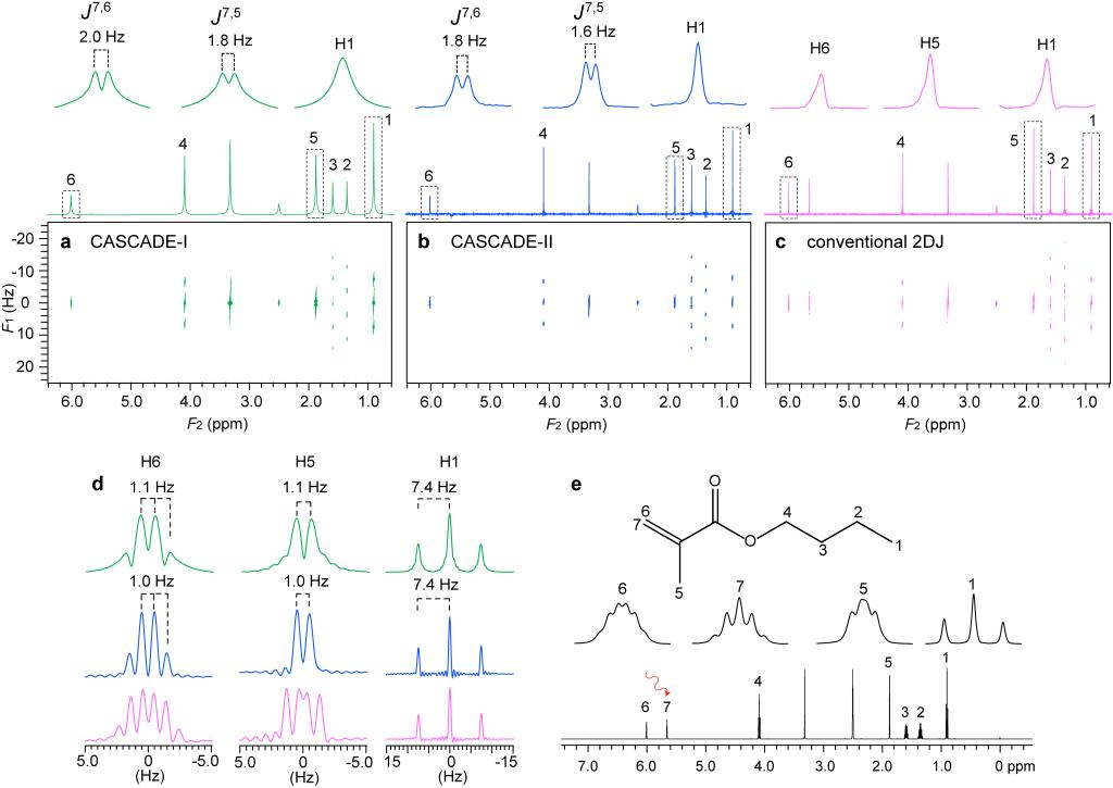 图1. 在甲基丙烯酸丁酯上的实验结果,CASCADE实验中的选择性180°脉冲作用在氢核H7上。(a) 绝对值模式的CASCADE二维谱;(b) 纯吸收模式的CASCADE二维谱;(c) 纯吸收模式的传统二维J谱;(d) 相应的间接维投影;(e) 常规一维谱。