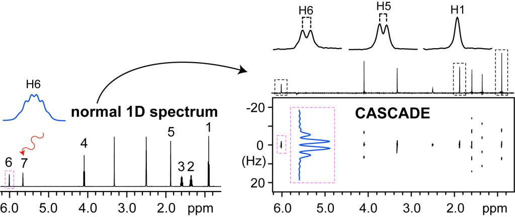 核磁共振波谱是研究分子性质和相互作用的强大的分析工具。同核偶合可以提供宝贵的分子结构信息,但是由于复杂的多重峰和信号重叠,偶合经常难以在拥挤的核磁共振氢谱中解析出来。多维核磁共振实验能提供更好的信号分散度,把核磁共振的分析能力推向新的台阶。其中,二维J分解谱被广泛应用在多重峰分析和偶合常数测量。这里,我们提出一种新型的二维J分解谱方法,名为CASCADE(coupling analysis by selective coupling allocation and disentanglement)。通过这个方法,可以更方便地分析多重峰,同时也能准确无误地测量某些特定地偶合常数,充分拓展了二维J分解谱的威力。这个方法有望在很多情况下替代传统二维J谱实验,促进分子结构与构象研究以及化学生物研究。