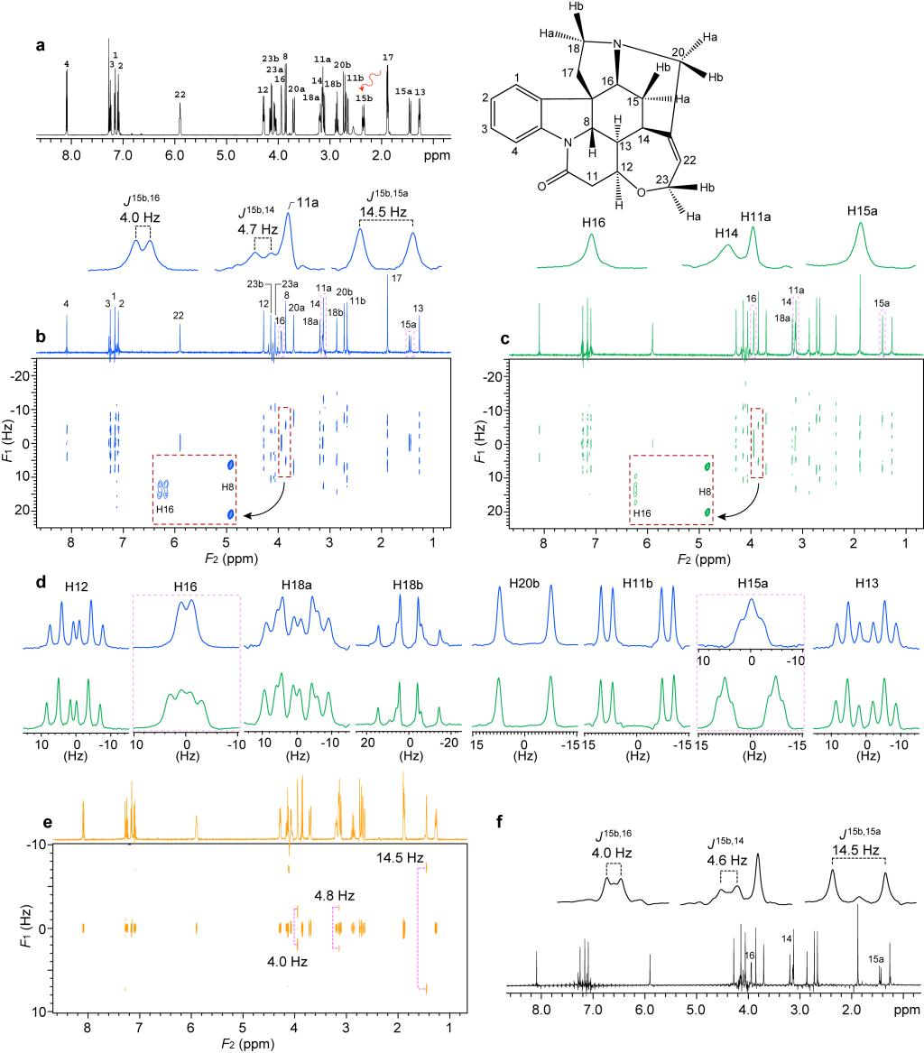 图2展示的是在士的宁上的实验结果。图2b和c分别展示的是纯吸收模式的CASCADE谱和传统二维J谱。从CASCADE谱的直接维投影中,同样可以测量出H15b和H16,H14,H15a之间的偶合。而在间接维投影中,相关的多重峰也被简化了(图2d)。在45°旋转后的传统二维J谱中,每个信号都呈现一条沿F1方向的多重峰。而在CASCADE二维谱,跟选择的核相偶合的核会在二维谱中呈现两条相同的沿F1方向的多重峰,而其他核则呈现出一条多重峰。例如,从这两张二维谱中的小插图可以看到,H16和H8在传统二维J谱中都呈现一条多重峰(图2c);而在CASCADE谱中,跟H15b相偶合的H16呈现出两条相同的多重峰,而H8只呈现出一条多重峰(图2b)。CASCADE的这个性质可以帮助辨别需要测量的相关的偶合。该方法也跟PSYCHEDELIC实验做了比较。图2e的PSYCHEDELIC二维谱在间接维可以测量跟H15b相关的偶合。图2f的PSYCHEDELIC一维谱中,跟H15b相偶合的核表现出二重峰,而其他核都呈现单峰,这跟CASCADE二维谱的直接维投影类似。但是PSYCHEDELIC二维和一维谱都不能提供简便的多重峰分析。