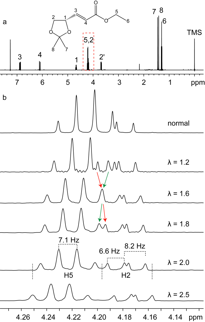 图3. 在ethyl (S)-(+)-3-(2,2-dimethyl-1,3-dioxolan-4-yl)-2-propenoate上的实验结果。(a) 常规一维谱;(b) 化学位移放大的谱图。