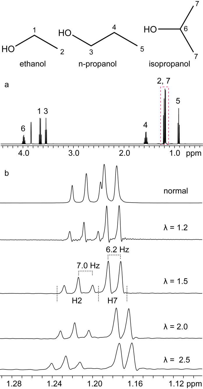 图4. 在乙醇、正丙醇和异丙醇的混合溶液中的实验结果。(a) 常规一维谱;(b) 化学位移放大的谱图。