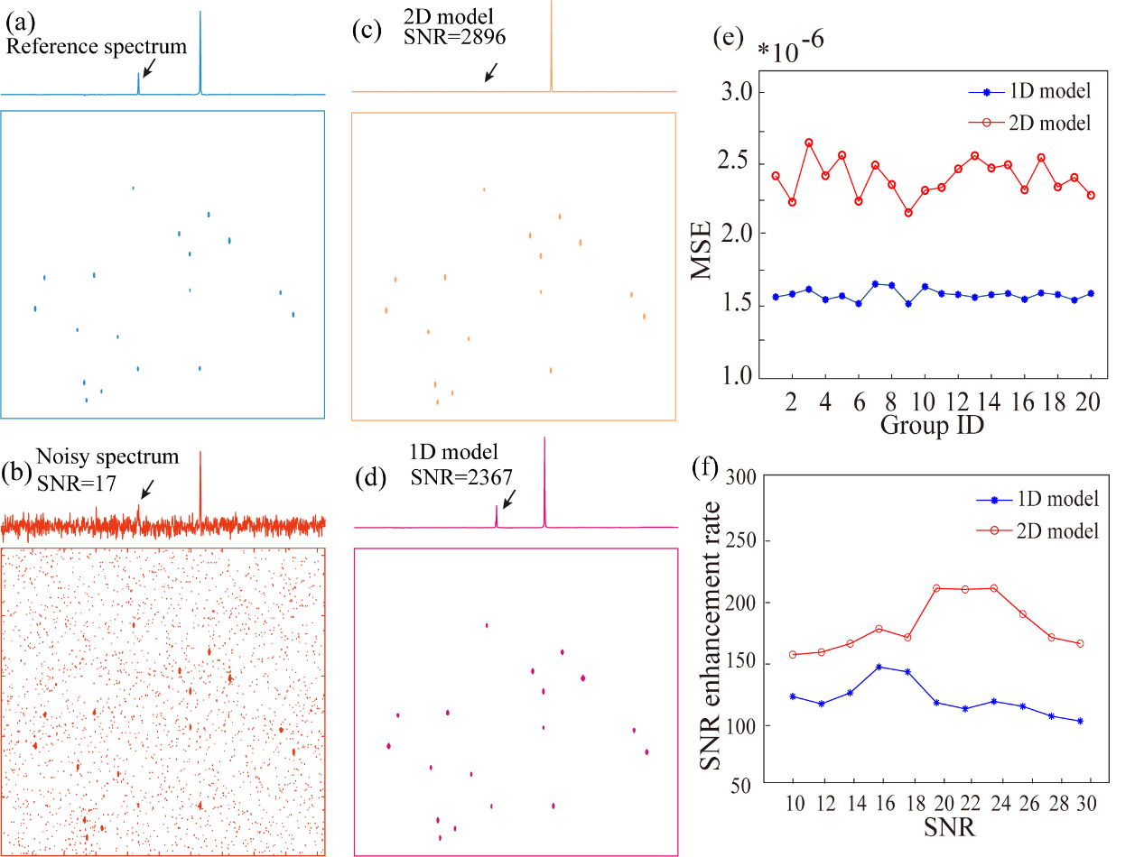 图2. (a -d)一维和二维模型对二维模拟波谱去噪的典型结果。(a)参考谱,(b)噪声谱,(c,d)采用2D (c)和1D (d)模型对(b)中的谱进行去噪后得到的谱。(e)一维和二维模型处理的20组(噪声谱信噪比在20 ~ 80之间)100张模拟谱上的MSEs平均值。(f)一维和二维模型处理的11个噪声级的10张模拟波谱的信噪比增强倍数平均值。
