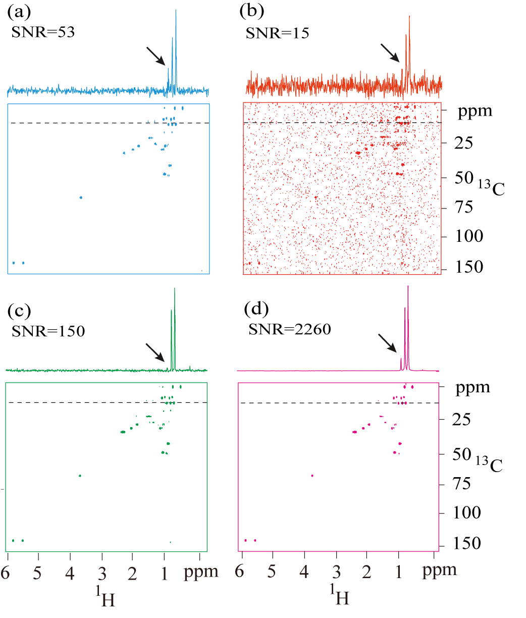 图4.浓度为0.08 M/L 胆固醇CDCl3溶液的2D 1H -13C HSQC NMR谱。(a)扫描数为32的参考波谱。(b)扫描数为4的噪声波谱。用参数α=0.1,β=100,ε=0.22的NASR方法 (c)和DN-Unet (d)对(b)进行去噪后得到的波谱,将(b-d)的波谱绘制在相同的level水平上。(a)的作图level不同,因为(a)的峰值强度要高得多。从二维谱上的虚线位置提取二维谱上的4个一维轨迹。