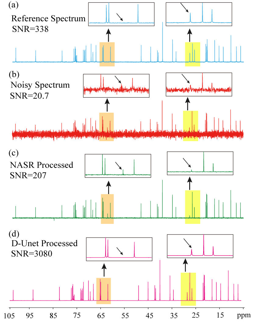 图3.浓度为0.2 M/L 阿奇霉素CDCl3溶液的1D 13C NMR谱。 (a)1024次扫描的参考波谱。(b) 4次扫描的噪声波谱。用参数为α=0.1,β=100,ε=0.22的NASR (c)和DN-Unet (d)对(b)中的波谱进行去噪后得到的波谱,棕色和黄色标记的区域展开为黑色矩形。
