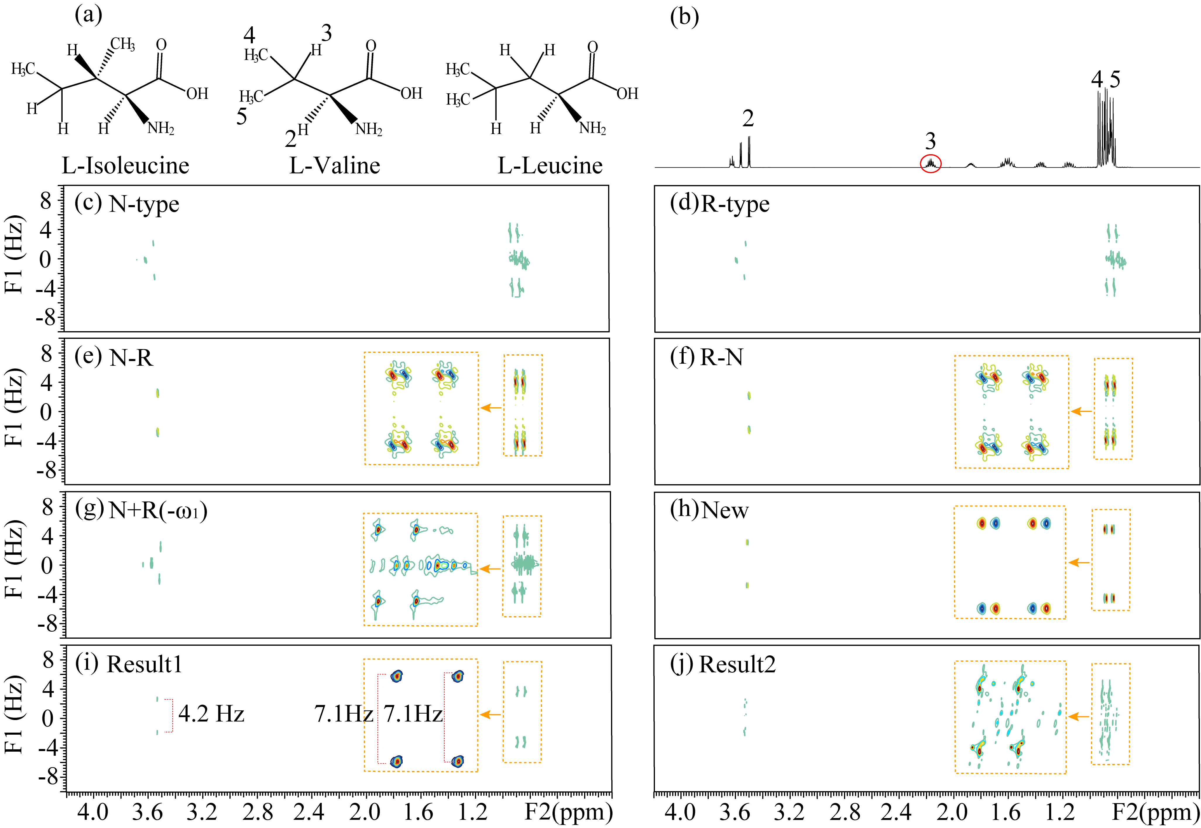 图2. (a)混合样品中的L-异亮氨酸、L-缬氨酸和L-亮氨酸的化学结构。(b)常规一维1H NMR谱。(c, d)从交错采样模式的数据中提取的N型(c)和R型(d)PSYCHEDELIC谱。(e) N-R型谱图。(f)R-N型谱图。(g)常规的Pell-Keeler数据后处理的谱图。(h) N-R型数据与反向R-N型数据相加的谱图。(i)仅保留(h)中的正信号所得的谱图。(j) 使用新型的数据后处理方式处理相继采样的N型和R型数据得到的谱图。