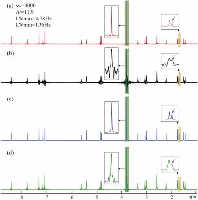 图2. 浓度为0.05 M/L奎宁光谱。(a)完全采样的PSYCHE纯位移谱 (1分35秒), (b) 15.6%采样率的PSYCHE纯位移谱(15秒), (c)使用PS-ResNet重建的波谱, (d)使用IST重建的波谱。图中显示了谱宽(sw),峰的最大和最小振幅比(Ar),以及最大线宽(LWmax)和最小线宽(LWmin)。