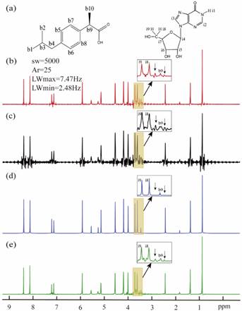 图4.浓度为0.2 M/L肌苷和 0.25 M/L布洛芬混合物光谱。(a)布洛芬结构和肌苷结构,(b)完全采样PSYCHE纯移谱(1 min35 s), (c) 15%采样纯移谱(15 s), (d)和(e)分别使用(d) PS-ResNet和(e) IST重建光谱。