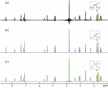 图3.浓度为0.05 M/L奎宁光谱。(a) 9.4%采样率的PSYCHE纯位移谱, (b)使用PS-ResNet重建的波谱, (c)使用IST重建的波谱。