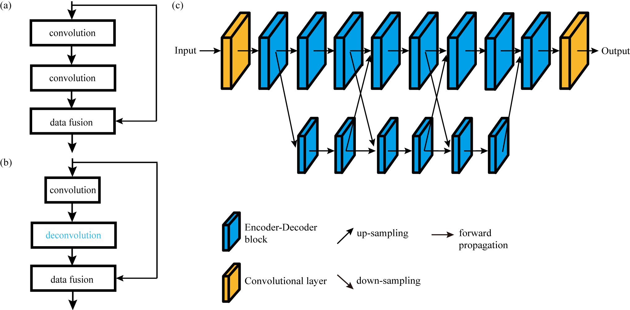 Figure 1. (a) Residual learning block. (b) Encoder-Decoder (ED) learning block. The convolution layer is an encoder that reduces data dimensionality, and the deconvolution layer (blue) is a decoder that recovers data dimensionality. (c) The proposed EDHRN which is based on HRNet. It consists two parallel subnetworks. The upper subnetwork contains ED blocks and convolutional layers, and the lower subnetwork is formed only by ED blocks. There are repeated connections between the two subnetworks by down-sampling and up-sampling.