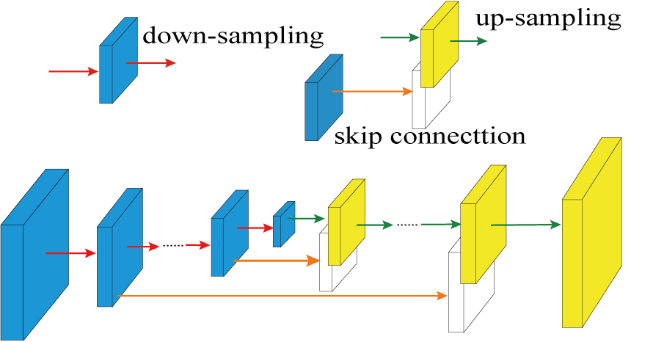 Figure 2. The overall architecture of DN-Unet including down-sampling, up-sampling, and skip connection. The red, green, and orange arrows show the down-sampling operations for shrinking the size, the up-sampling operations for recovering the size and the skip connections for retaining spectral details lost during down-sampling, respectively.